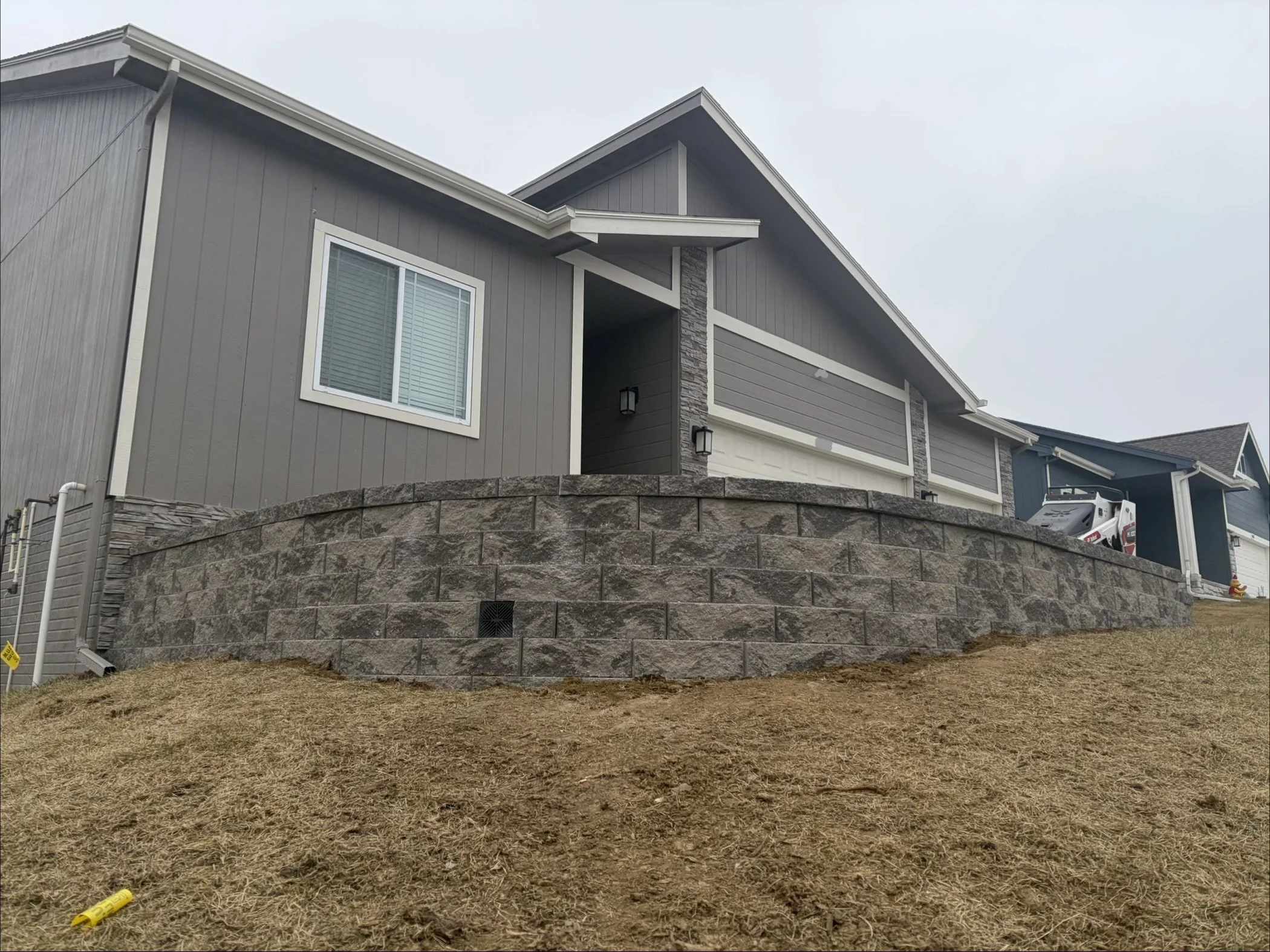 This project was a residential retaining wall. The client was having issues with a substantial slope in their front yard and a desire for a little bit more useable space out front. We were able to build an amazing curved retaining wall that blended beautifully with the coloring of the house.